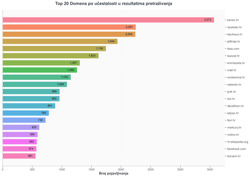 S obzirom na to da imam iskustva u ovim nišama, rezultati nisu bili iznenađujući. Primjetna je zastupljenost istaknutih brendova, ali i poprilično visoka stopa zastupljenosti shopova koji nude veliki raspon proizvoda iz različitih kategorija (Pevex, Bauhaus, Ikea, Bazzar, Emmezeta, Mall itd.) ili agregatora/oglasnika (Njuškalo, Jeftinije) dok je dio klikova (primarno za proizvode) otišao ili na Wikipediju ili na Facebook marketplace. Agregirano, ovo ne daje previše informacija, bilo bi dobro raditi segmentaciju po industriji ili barem široj kategoriji keyworda, ali donekle prati moju pretpostavku iz iskustva da u kompetitivnim nišama, posjetitelji gravitiraju poznatome i jednostavnome i da u pravilu širok raspon asortimana ima direktnu korelaciju sa performanceom, a prostora za nišne shopove je sve manje.