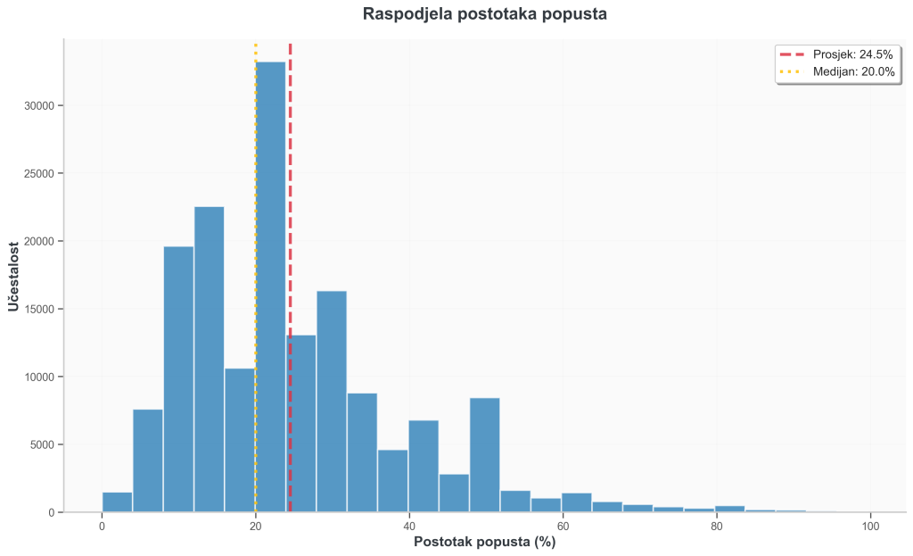 Za početak, malo zanimljivosti s uvidom u raspodjelu popusta unutar analiziranog dataseta. Očekivano, podaci pokazuju da se popusti uglavnom kreću u rasponu od 20 do 30% s prosječnim popustom od 24.5% i medijalnim popustom od 20%.