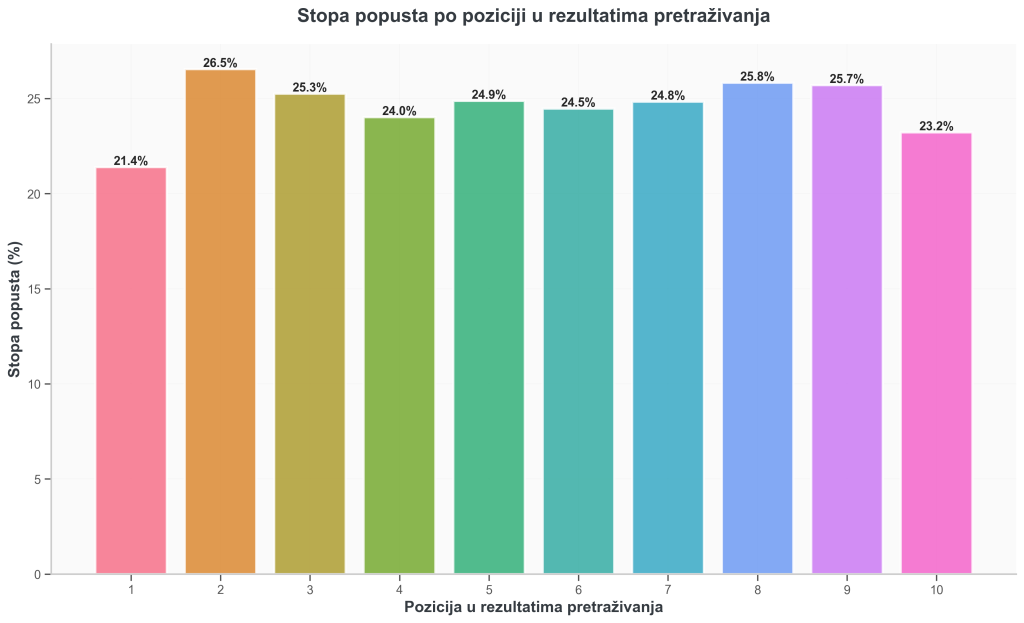 Postoji statistički značajna pozitivna korelacija između pozicije ranka i prisutnosti popusta (r=0,028, p<0,001), što ukazuje da stranice koje rangiraju niže imaju tendenciju da nude nešto više ili veće popuste. Međutim, ova korelacija je izuzetno slaba i praktički beznačajna. Dok nam velika veličina uzorka omogućava da statistički detektiramo ovaj obrazac, veličina učinka je premala da bi sugerirala da popusti značajno utječu na pozicije rangiranja. Praktično gledano: nuđenje popusta ne pruža značajnu SEO prednost niti nedostatak.