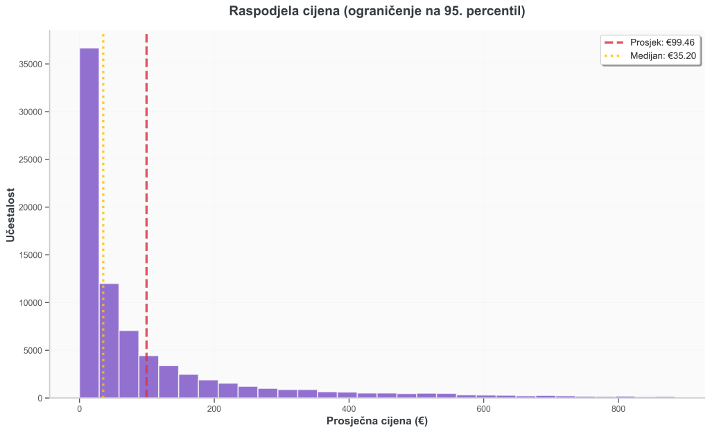 - Cijene iznad 30.000 € isključene su iz analize kako bi se spriječilo izobličenje uzrokovano ekstremnim vrijednostima (a takvih proizvoda je ionako bilo iznimno malo)
