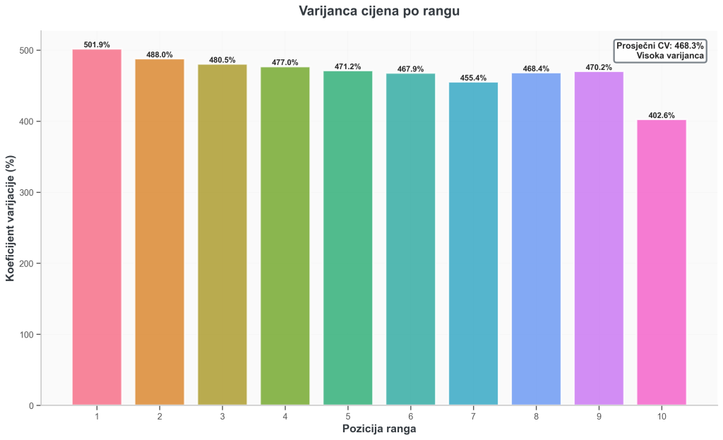 Iz gorespomenutog razloga s ograničenjima koreliranja popusta i performancea, nisam se htio fokusirati na korelaciju prosječne cijene (jedino što bi imalo smisla je možda korelacija cijena za 10 najvidljivijih ili za najvidljiviji proizvod) već na varijacije samih cijena, idući s pretpostavkom da postoji direktna veza između varijabilnosti cijena (u pravilu kao rezultat širine ponude proizvoda) i pozicije. Kao i u svim analizama do sada, direktna korelacija je nemoguća u ovako kompleksnim sustavima, ali graf distribucije varijacije je poprilično indikativan i na njemu možemo vidjeti da postoji jasna veza između prosječne pozicije i varijacije cijena. Iz ovoga možemo zaključiti da shopovi koji imaju širi cjenovni raspon, vjerojatno i ponudu proizvoda (“za svakoga ponešto”) imaju tendenciju boljeg rangiranja. Ovo je nešto što bismo i očekivali od algoritma koji nagrađuje potrošača.