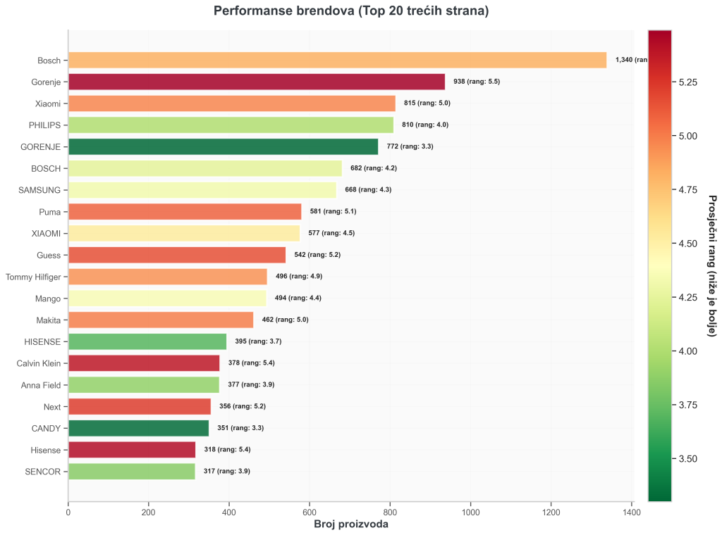 Ovdje možemo slobodno zanemariti prosječnu poziciju – zgodno je za pogledati, ali najjači brendovi imaju puno širu mrežu partnera i distributera te se u pravilu pojavljuju na više shopova, a samim time će i prosječna pozicija biti niža. Međutim, gledajući zastupljenost ovih brandova, ovdje je sve onako kako bismo očekivali – najviše su zastupljeni najpopularniji brendovi, sasvim očekivano i logično.