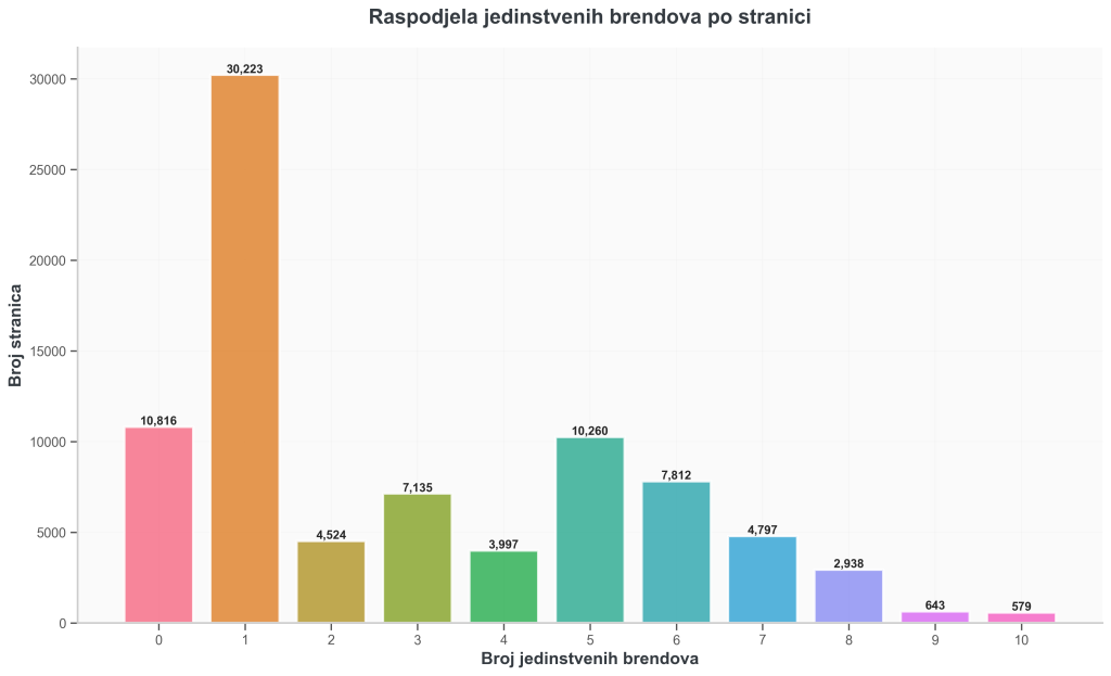 Ako gledamo distribuciju jedinstvenih brendova, možemo vidjeti da većina stranica ne nudi ili niti jedan brend (tj. nije jasno istaknut ili je generički brend) ili samo jedan brend u ponudi. Rezultat je to činjenice da ljudi u pravilu imaju pretrage koje su dosta određene (npr. Nike tenisice) i onda je za očekivati da će većina stranica sadržavati točno ono što korisnik traži – još jedan argument više u korist razrade i implementacije facetirane navigacije i kvalitetne i dobro promišljene taksonomije.
