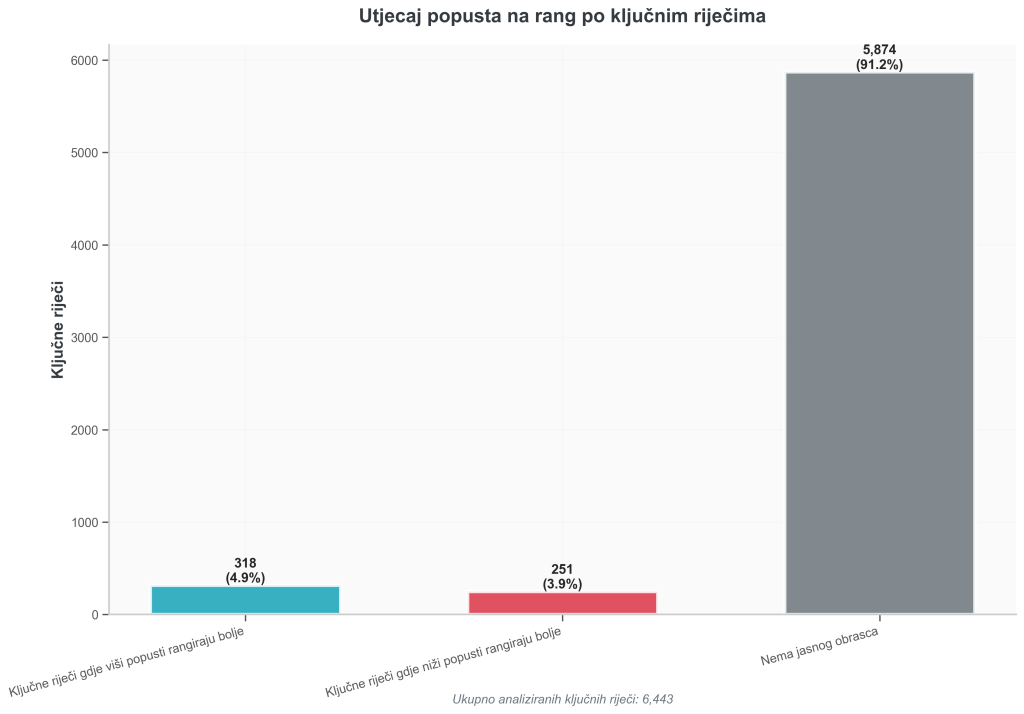 Za sada se moramo zadovoljiti time da, agregirano, nema jasnog obrasca između iznosa popusta i rangiranja sa preko 90% ključnih riječi kod kojih nije uočen nikakav jasan obrazac.