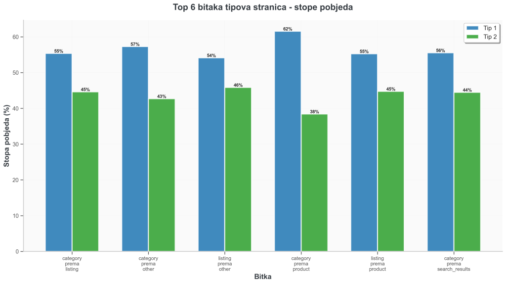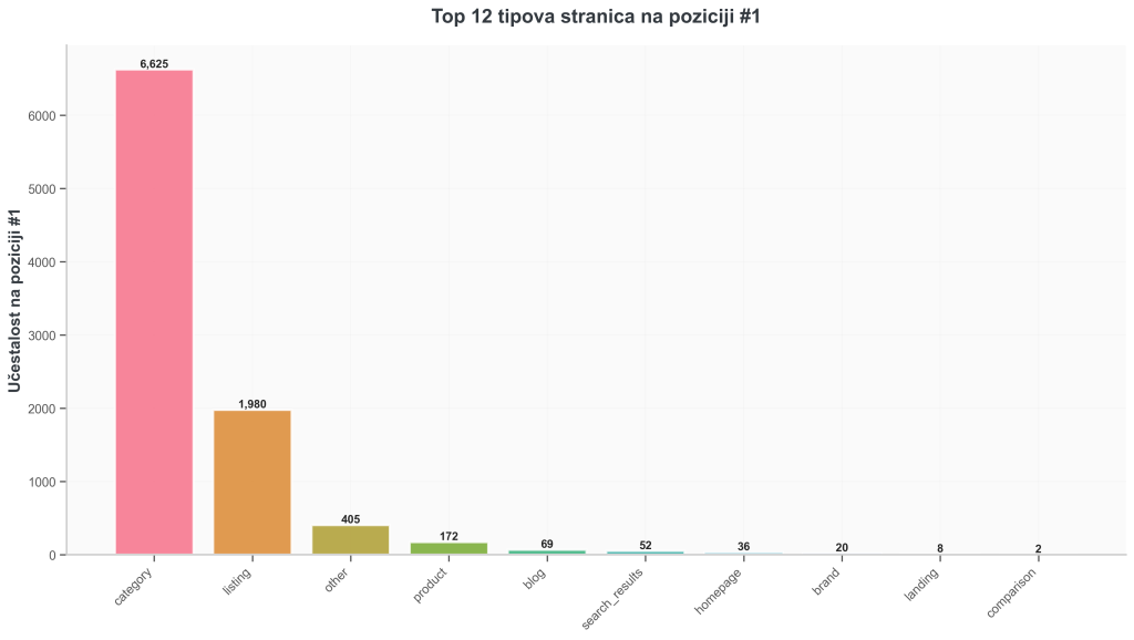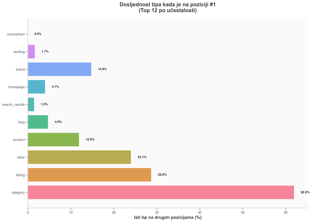 Prvo, ako pogledamo čitav ovaj analizirani dataset i koliko se često različiti tipovi stranica nalaze u međusobnom “okršaju”, odnosno nadmeću se za isti keyword, vidljivost i zastupljenost kategorija je golema.