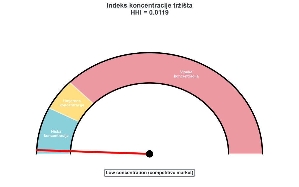 Išao sam malo u overkill pa sam išao računati Herfindahl-Hirschman Index (HHI) za hrvatsko tržište koji je u ovom slučaju pokazao ekstremno nisku koncentraciju na tržištu što je oznaka podosta kompetitivnog tržišta. Naravno, ovakve analize bi bilo pametnije raditi na razini pojedinih vertikala, a ne na ovako šarolikom uzorku jer šansa da imamo jednog monopolista koji dominira čitavim e-commerce segmentom je jako niska, ali svejedno, podaci upućuju na popriličnu diverzifikaciju unutar tržišta.