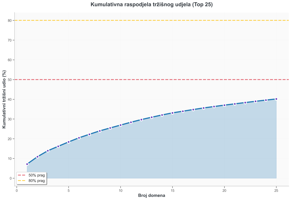 Kako je moguće vidjeti na grafu, top igrači zauzimaju tek 22.3% promatranog tržišta, a uključivanje krivulje zastupljenosti na tržištu pokazuje da je u pitanju stabilan rast bez posebno izraženog skoka u vidljivosti s uključivanjem novih konkurenata. Bez obzira na visoku vidljivost ključnih igrača, njihova “dominacija” je ipak prenaglašena, ali ne i za zanemariti.