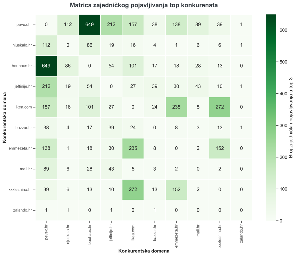 Još jedna stvar koju sam htio provjeriti je količina preklapanja ovih top domena. Samo ova stvar bi mogla biti posebna analiza za sebe i jedna sveobuhvatna competitive gap analiza po različitim vertikalama bi bila jako zanimljiva, ali u ovom trenutku neostvariva. Pa ipak, ovaj analizirani set ključnih riječi nam također daje neke zanimljive uvide i pokazuje da postoji relativno velika razina preklapanja konkurenata unutar top 3 pozicije (a to je ono što bi nam, realno, u e-commerce segmentu jedino i trebalo biti od interesa). Ovo je na tragu onoga što sam očekivao, a daljnji uvid u podatke pokazuje da kada su ti konkurenti grupirani, jako teško, gotovo nemoguće je da će netko izvan “probranog društva” imati pristup tim pozicijama.