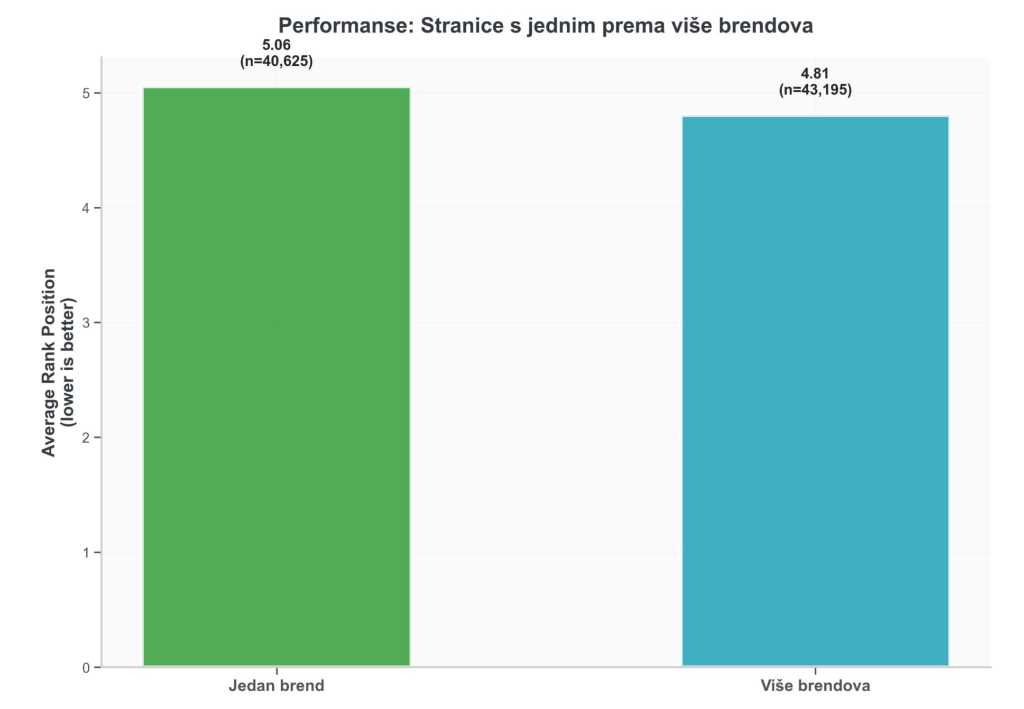 Pa ipak, u uvjetima kada korisnik traži nešto što nije određeno brendom ili nekim drugim atributom (dakle, generičke pretrage tipa “tenisice cijena”) podaci pokazuju da postoji solidna prednost koja ide u prilog stranicama sa više brandova u odnosu na stranice sa manje brandova u ponudi.